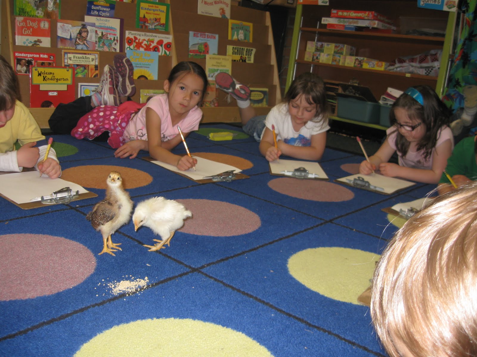 Today Lucky and Cookie came out into the classroom so the kindergarteners could draw them. We are going to include these drawings with a letter we are sending to Russell Elementary Kindergarten. Russell Elementary Kindergarteners have hatched chicks in their classes as well and we are beginning to correspond with them about our shared interest in chickens!